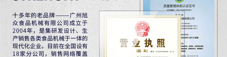 廣州旭眾食品機械有限公司是一家集科研開發(fā),生產(chǎn)設(shè)計,營銷服務(wù)為一體的現(xiàn)代化生產(chǎn)企業(yè)?,F(xiàn)代化生產(chǎn)車間,精湛制造技術(shù),所產(chǎn)機械歷經(jīng)市場重重考驗,不斷贏得海內(nèi)外客戶的贊譽。