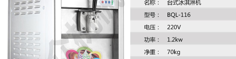 BQL-116臺(tái)式冰淇淋機(jī),●選用國(guó)際名牌成熟制冷配套件和高效壓縮機(jī),融合旭眾精湛工藝輔以嚴(yán)格的質(zhì)量控制流程,使產(chǎn)品整體性能及品質(zhì)得以全面提升?!癫捎萌珨?shù)字電腦控制系統(tǒng),選用名牌優(yōu)質(zhì)電器元件,先進(jìn)的生產(chǎn)工藝,故障診斷,軟硬任意調(diào)制,自動(dòng)修復(fù)功能,安全精確,可靠性更高?!駥?zhuān)業(yè)成熟制冷系統(tǒng)設(shè)計(jì),選用世界名牌大功率專(zhuān)用壓縮機(jī),大大縮短冰淇淋成型時(shí)間,相同時(shí)間內(nèi)冰淇淋產(chǎn)量大幅度增加,使您生意火爆時(shí)依然得心應(yīng)手,為您創(chuàng)造財(cái)富?!癜踩椒€(wěn)的機(jī)械攪拌系統(tǒng),噪音更低、振動(dòng)更小,使整機(jī)運(yùn)行性能達(dá)到國(guó)際先進(jìn)水平?!翊_保進(jìn)料溫度在0°C~35°C;環(huán)境溫度5°C~40°C勻可正常使用。