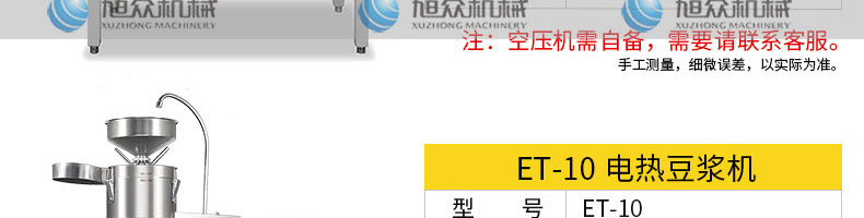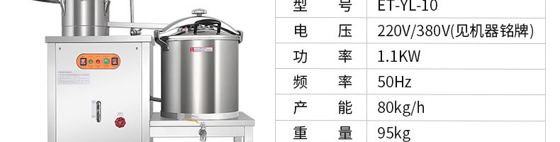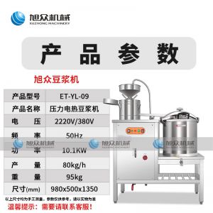 ET-YL-09壓力電熱豆?jié){機(jī),多功能商用豆?jié){機(jī),細(xì)、香、濃。我們珍惜每一顆大豆,讓每顆大豆進(jìn)發(fā)營(yíng)養(yǎng)價(jià)值。旭眾豆?jié){機(jī)做您的招牌豆?jié){打磨細(xì)膩、口感香濃、回味無(wú)窮。