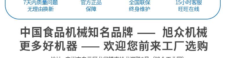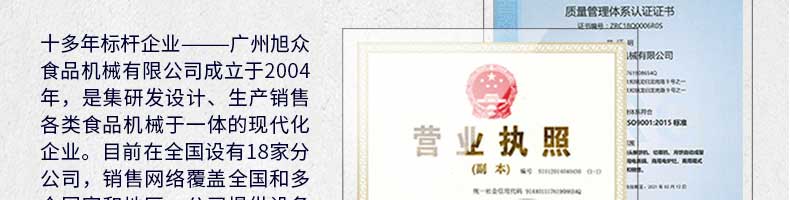 廣州旭眾食品機(jī)械有限公司是一家集科研開發(fā),生產(chǎn)設(shè)計(jì),營銷服務(wù)為一體的現(xiàn)代化生產(chǎn)企業(yè)?,F(xiàn)代化生產(chǎn)車間,精湛制造技術(shù),所產(chǎn)機(jī)械歷經(jīng)市場重重考驗(yàn),不斷贏得海內(nèi)外客戶的贊譽(yù)。