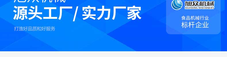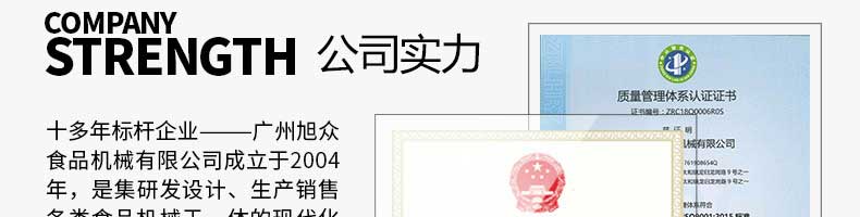 廣州旭眾食品機械有限公司是一家集科研開發(fā),生產(chǎn)設計,營銷服務為一體的現(xiàn)代化生產(chǎn)企業(yè)。現(xiàn)代化生產(chǎn)車間,精湛制造技術(shù),所產(chǎn)機械歷經(jīng)市場重重考驗,不斷贏得海內(nèi)外客戶的贊譽。